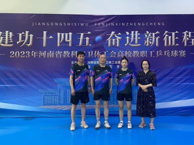 6月8日至11日,由河南省教科文卫体工会主办的“建功十四五、奋进新征程”2023年河南省教科文卫体系统职工乒乓球比赛在信阳师范大学举行,来自全省高校38个代表队200余人参加了比赛。我校由郑新安、王娟、杜晨笛、李海鹏组四位老师组成运动员代表队,由校工会杨明辉领队。