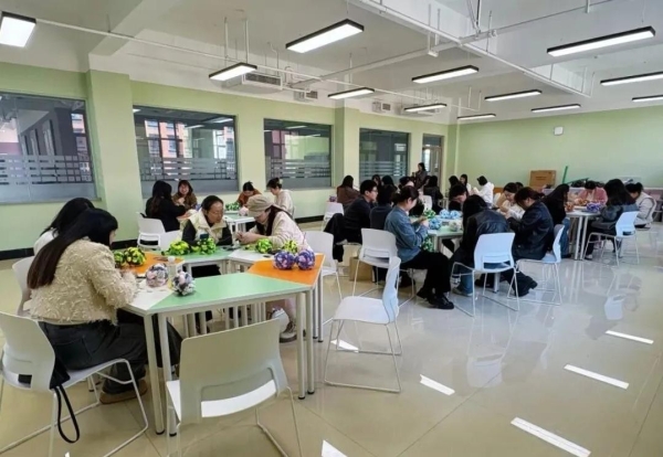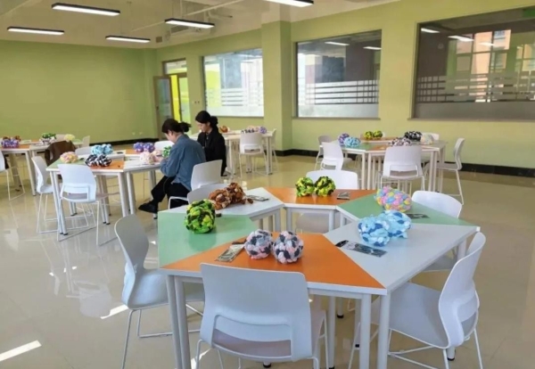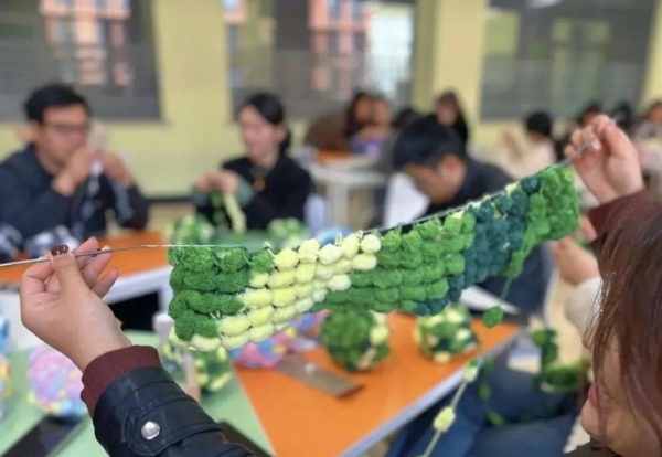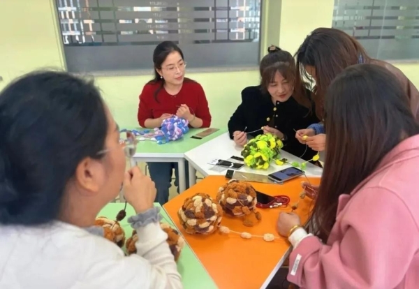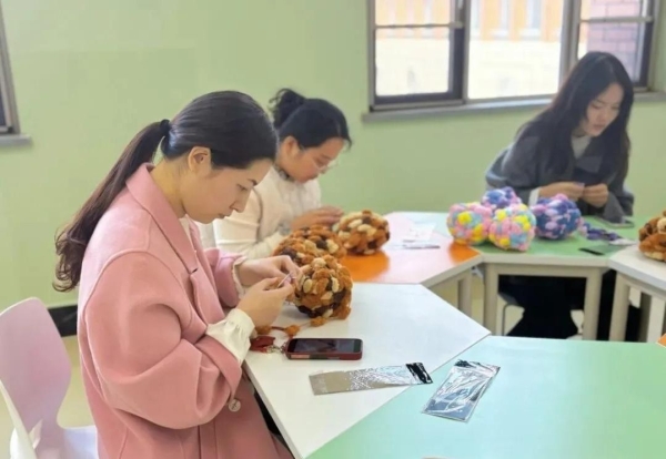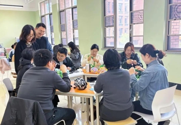 老师们专注投入,手法从生疏到熟练,钩针在毛线间灵活穿梭,渐渐掌握了编织的技巧。大家不时交流编织经验,分享制作心得,现场氛围融洽而欢快。