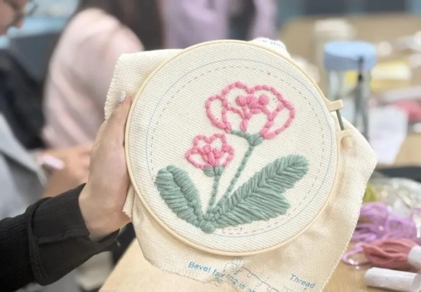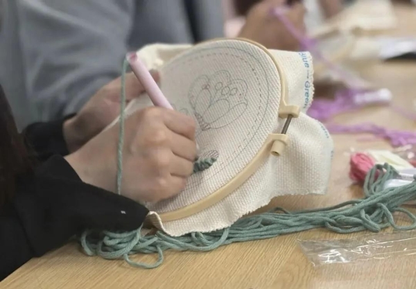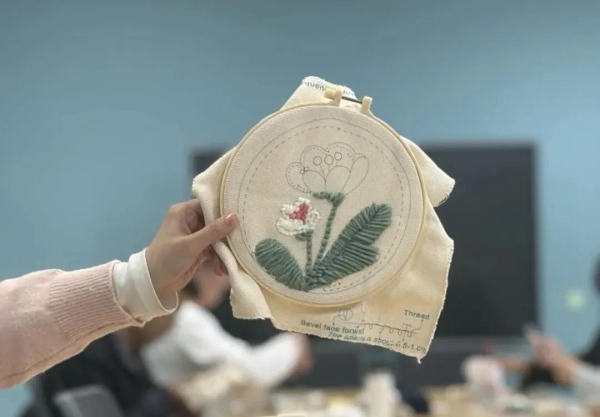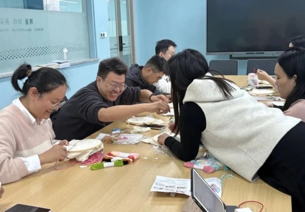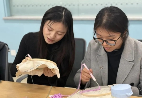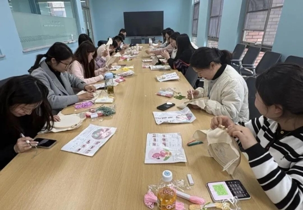 活动现场气氛热烈,老师们专注投入,手法从生疏到熟练,针线在手中灵活穿梭。大家不时交流刺绣经验,分享制作心得,现场氛围融洽而欢快。