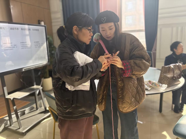 讲座结束后,温馨有趣的艾草养生锤制作环节拉开序幕。老师们有序领取艾草包、棉布、木柄、棉绳等材料包,“艾草填充八分满,压实才不易松散”“棉线缠绕紧一点,防止使用时脱落”,老师们互相分享制作技巧,相互协作。现场艾草飘香、笑语不断。经过半个多小时的制作,一个个散发着清新艾香的手工艾草锤陆续完工,大家拿着自己的作品互相试用,成就感满满。