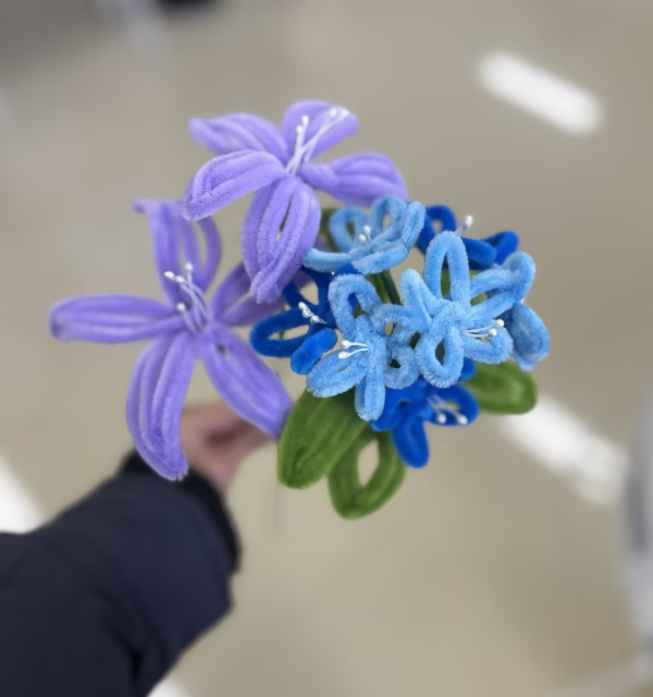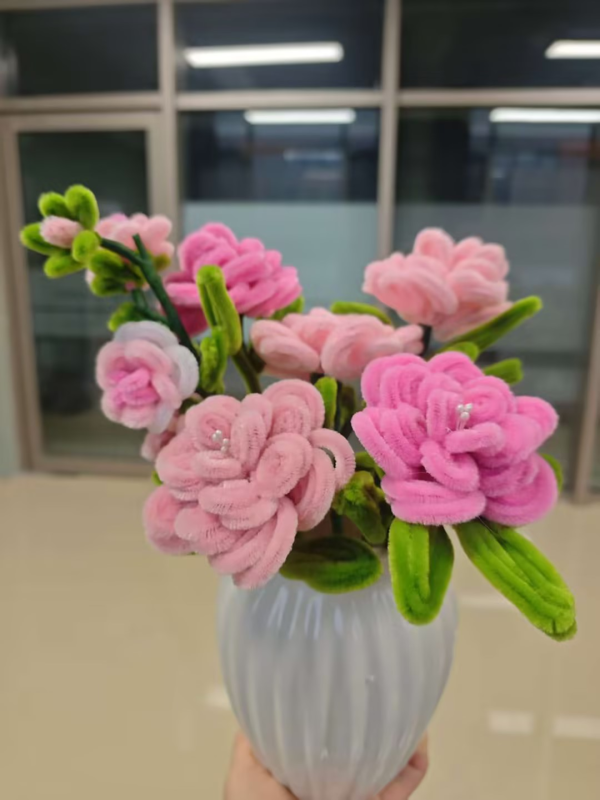 活动现场,圆桌上整齐摆放着色彩缤纷的制作材料,大家在刘晓莹老师的细致讲解与分步示范下,开启了一场指尖上的艺术之旅。老师们或凝神专注于手中的“花瓣”造型,或相互交流技巧心得,现场气氛专注而融洽。原本简单的材料,逐渐演变成为一朵朵形态各异、栩栩如生的花朵——绽放的玫瑰、优雅的薰衣草、热烈的向日葵,还有充满想象力的组合花卉。再加以枝叶的搭配,一束束独一无二、充满巧思的扭扭棒花束便陆续诞生。